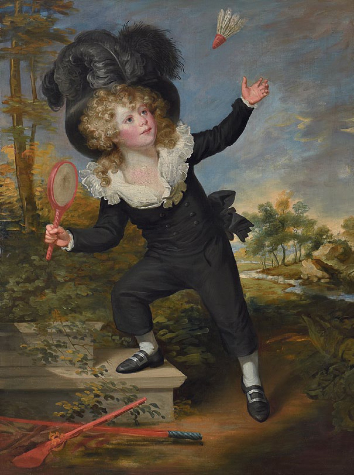 Vers 1790, le jeune Kenneth Dixon, un angélique blondinet, né en 1782 (et décédé en 1814, d’un accident de transport), est portraituré par Sir William Beechey, jouant au « volant » dans un décor champêtre. Une campagne anglaise où coule une douce rivière, paysage peut-être typique du Hertfordshire, compté situé au Nord de Londres où réside sa noble famille.